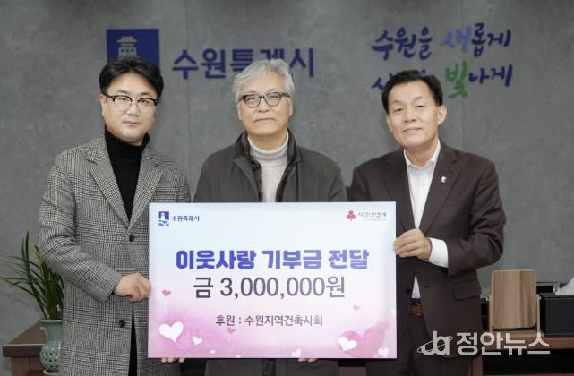 이웃돕기성금 300만 원은 수원지역건축사회 회원 137명이 모금해 마련했다. 수원지역건축사회는 2024년에도 이웃돕기성금 300만 원을 기부한 바 있다.