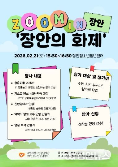 정안뉴스 안정주 기자 | 수원시청소년청년재단(이사장 최종진) 장안청소년청년센터는 시설 이용 활성화를 위한 프로그램 ZOOM IN 장안을 통해 청소년, 지역주민과 소통하고자 2월 21일 오후 1시30분 ~ 오후 4시30분까지 ‘장안의 화제’을 운영한다고 밝혔다.