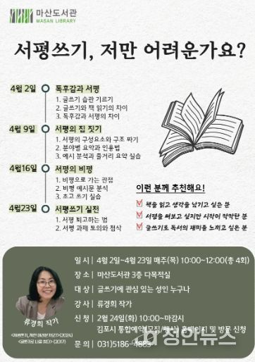 정안뉴스 안정주 기자 | 김포시 마산도서관은 오는 4월 2일부터 23일까지 매주 목요일 오전 10시부터 12시까지 성인 대상 글쓰기 특강 ‘서평쓰기, 저만 어려운가요?’를 운영한다.