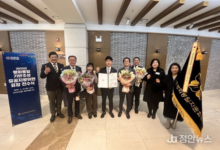 정안뉴스 황정혜 기자 | 국민과 함께 만드는 평화 공존과 공동 성장을 목표로 새롭게 출범한 제22기 민주평화통일자문회의 부산연제구협의회(협의회장 김영민)는 2026.2.12. 14:00 부산코모도호텔 2층 해마루홀에서 진행된 “2025년 평화통일 기반조성 유공자문위원 표창 전수식”에서 평화통일 기반조성, 민주평통 발전, 국가 및 사회 발전에 뚜렷한 공적을 인정받아 부산에서는 유일하게 “2025년 민주평화통일자문회의 의장(대통령) 단체표창” 수상의 쾌거를 거뒀다.
