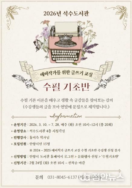 정안뉴스 안정주 기자 | 안양시 석수도서관은 문학과 글쓰기에 관심 있는 안양 시민을 대상으로 ‘예비작가를 위한 글쓰기 교실’ 수필 기초반 및 소설 창작반을 운영한다고 13일 밝혔다.