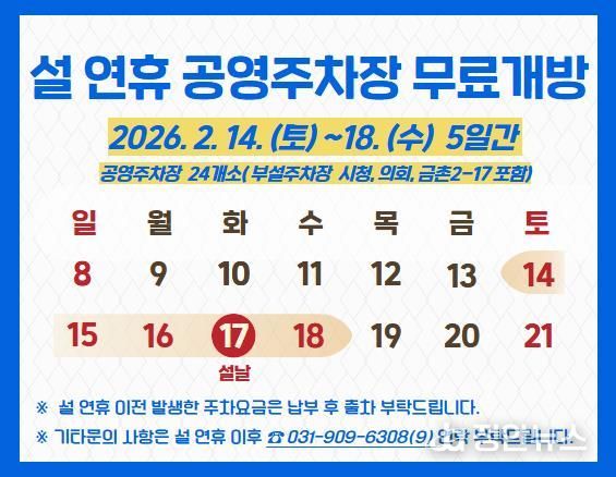 정안뉴스 안정주 기자 | 파주도시관광공사는 12일, 2026년 설 명절을 맞아 시민과 고향을 방문하는 귀성객의 교통편의를 위해 공영주차장 24곳(부설주차장 시청, 의회, 금촌2-17 포함)을 오는 14일(토)부터 18일(수)까지 5일간 무료로 개방한다고 밝혔다.