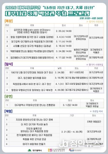 정안뉴스 안정주 기자 | 대구문화예술진흥원 박물관운영본부는 ‘2026년 대구시민주간(2.21.~2.28.)’을 맞아, 2월 21일부터 4월 30일까지 대구시립 3개 박물관(대구근대역사관, 대구방짜유기박물관, 대구향토역사관)에서 시민 참여형 문화행사를 개최한다.