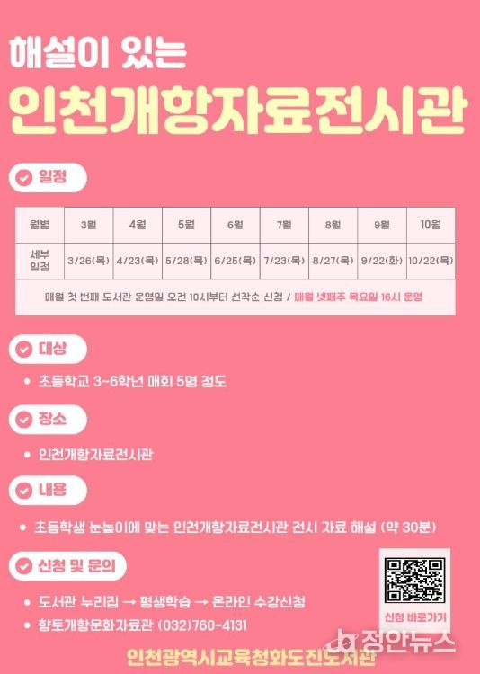 정안뉴스 안정주 기자 | 인천광역시교육청화도진도서관은 3월부터 10월까지 관내 초등 3~6학년을 대상으로, 향토 문화와 역사의 가치를 알리기 위한 ‘인천개항자료전시관’전시 해설 프로그램을 운영한다.