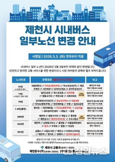 정안뉴스 황은경 기자 | 제천시는 시민들의 대중교통 이용 편의를 개선하고 변화된 지역 교통 환경을 반영하기 위해 3월 3일 첫차부터 시내버스 일부 노선을 개편해 운행한다고 밝혔다.