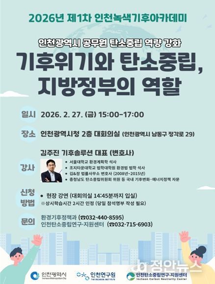 정안뉴스 안정주 기자 | 인천광역시는 2월 27일 시청 대회의실에서 공직자 및 공공기관 직원을 대상으로‘2026년 제1차 인천녹색기후아카데미’를 개최했다고 밝혔다.