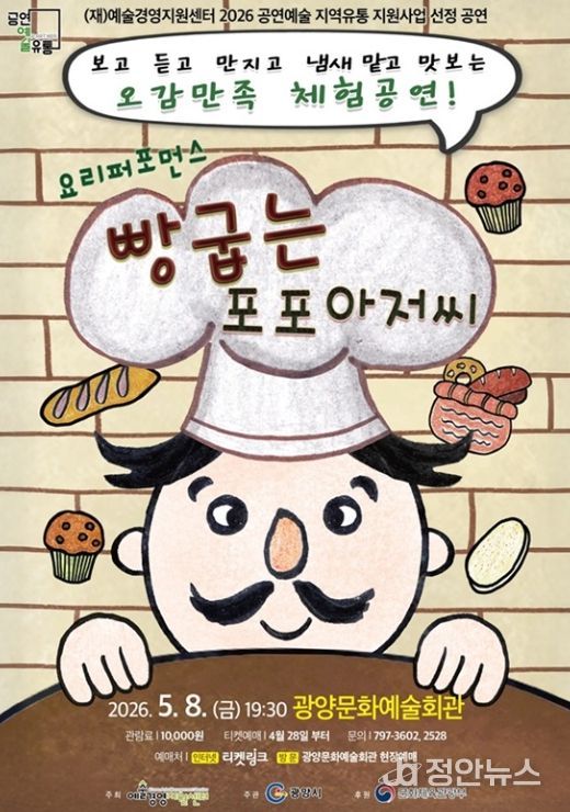 정안뉴스 안정주 기자 | 광양시는 5월 가정의 달을 맞아 오는 5월 8일 오후 7시 30분 광양문화예술회관 대공연장에서 극단선물의 어린이 참여형 뮤지컬 ‘빵굽는 포포아저씨’를 선보인다고 밝혔다.