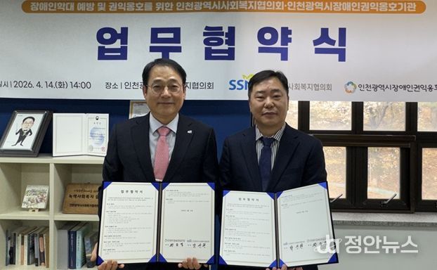 정안뉴스 안정주 기자 | 인천시사회서비스원 소속 인천시장애인권익옹호기관은 인천시사회복지협의회와 손잡고 장애인 학대 예방과 대응 체계 강화에 힘을 모은다고 19일 밝혔다.
