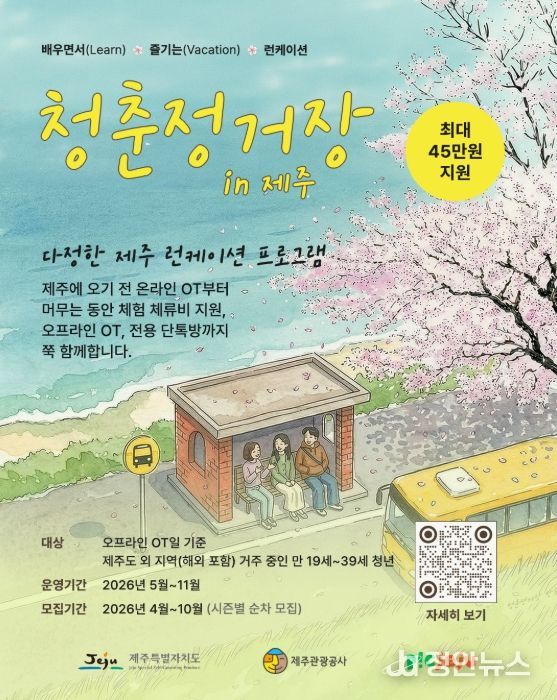 정안뉴스 안정주 기자 | 제주특별자치도와 제주관광공사(사장 고승철)는 오는 5월 3일까지 제주인구정책 통합플랫폼을 통해 도외 거주 청년을 대상으로 제주에서 배우며 방학을 즐길 런케이션 참가자를 모집하고 있다고 17일 밝혔다.