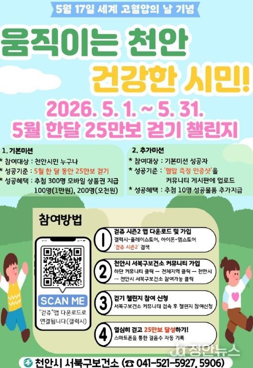 정안뉴스 안정주 기자 | 천안시 서북구보건소는 5월 한 달간 ‘움직이는 천안, 건강한 시민!’ 걷기 챌린지를 운영한다고 20일 밝혔다.