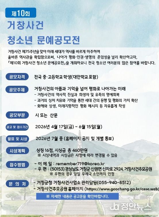 정안뉴스 김재홍 기자 | 거창군 거창사건사업소는 거창사건을 바르게 알리고 평화의 메시지를 전하고자, 4월 17일부터 6월 15일까지 전국 중·고등학생(대안학교 포함)을 대상으로 ‘제10회 거창사건 청소년 문예공모전’을 개최하여 작품을 접수한다고 밝혔다.