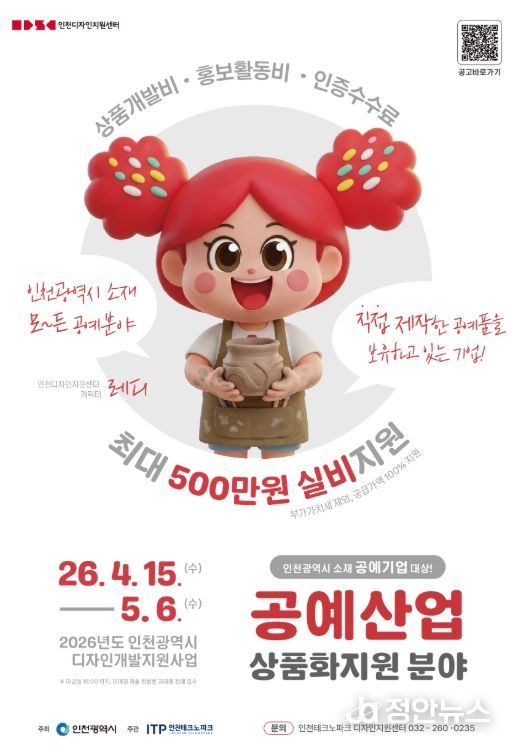 정안뉴스 안정주 기자 | 인천테크노파크(인천TP)는 인천 공예기업의 상품 경쟁력 강화를 위해 ‘2026년도 인천광역시 공예산업 상품화 지원사업’ 참여기업을 오는 5월 6일까지 모집한다.