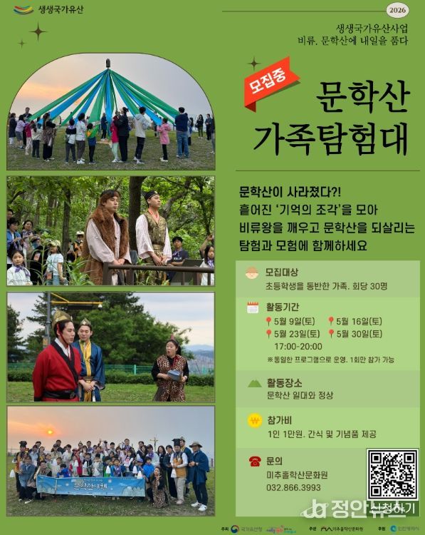 한편, ‘문학산 가족탐험대’는 국가유산청과 미추홀구가 주최하고 미추홀학산문화원이 주관하며, 인천광역시가 후원하는 2026 생생 국가유산 사업 ‘비류, 문학산에 내일을 품다’의 일환으로 운영된다.
