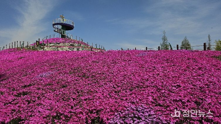 거창창포원에 봄을 알렸던 벚꽃이 진 뒤, 황강전망정원 일원에 진분홍빛 꽃잔디가 만개하고 있다. 이와 함께 튤립, 비올라, 데이지, 루피너스 등 다양한 꽃으로 정원을 단장해 나들이에 나선 나들이객들의 발길이 이어지고 있다.