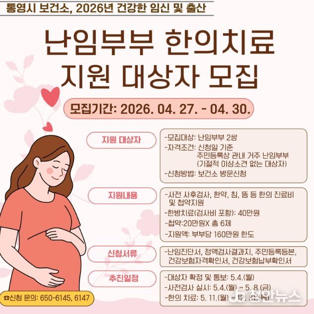 지원대상은 난임 검사에서 기질적 이상 소견이 없는 관내 난임부부 2쌍이다. 모집 기간은 오는 27일부터 30일까이며, 통영시 보건소 모자보건실을 방문해 신청하면 된다.