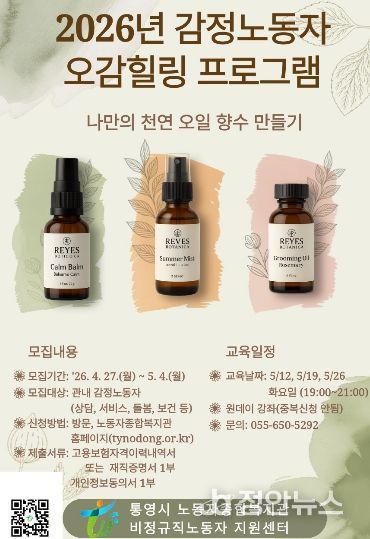 정안뉴스 김재홍 기자 | 통영시는 관내 서비스업, 돌봄, 보건, 상담 등 다양한 직군의 감정노동자들의 마음 치유와 휴식에 초점을 맞춰 ‘2026년 감정노동자 오감힐링 프로그램’을 통영시노동자종합복지관에서 운영한다고 22일 밝혔다.
