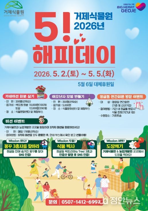 정안뉴스 김재홍 기자 | 거제시농업기술센터는 오는 5월 2일부터 5월 5일까지 거제식물원 일원에서 특별행사 ‘거제식물원 5! 해피데이’를 운영한다고 밝혔다.