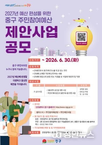 정안뉴스 안정주 기자 | 인천시 중구는 ‘2027년도 예산편성을 위한 주민참여예산 제안사업 공모’를 추진한다고 23일 밝혔다.