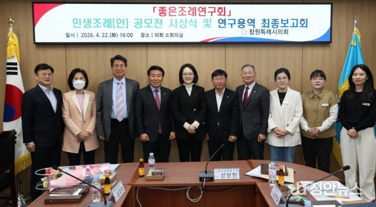 정안뉴스 김재홍 기자 | 창원특례시의회 좋은조례연구회는 22일 최종보고회를 열어 시민들의 삶의 질을 높이고자, 시민들이 직접 제안한 우수 조례안 아이디어를 공유했다.