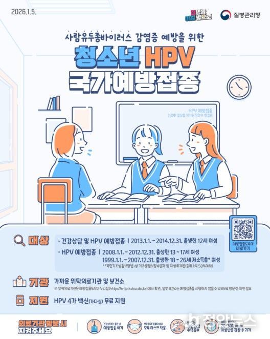 접종 대상자는 가까운 위탁의료기관 또는 보건소를 방문해 무료로 HPV 백신(HPV 4가)을 접종받을 수 있으며, 접종 가능 의료기관과 접종대상 해당 여부는 예방접종도우미 누리집을 통해 확인할 수 있다.