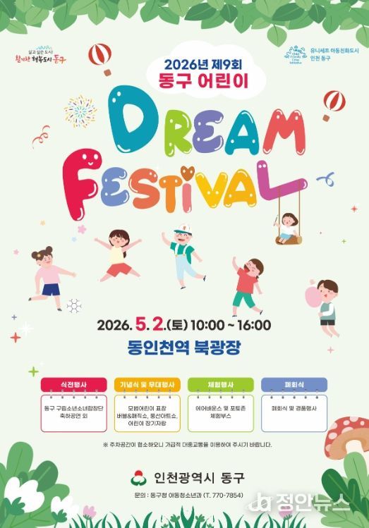 정안뉴스 안정주 기자 | 인천 동구는 오는 2일 동인천역 북광장에서 제104회 어린이날을 맞아‘2026년 제9회 동구 어린이 Dream Festival’을 개최한다고 밝혔다.