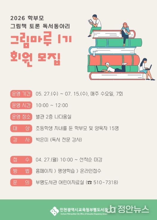 정안뉴스 안정주 기자 | 인천광역시교육청부평도서관은 학부모의 독서 역량을 강화하고 자녀와의 소통을 돕기 위해 2026년 상반기 학부모 독서동아리 ‘그림마루 1기’ 참여자를 모집한다.