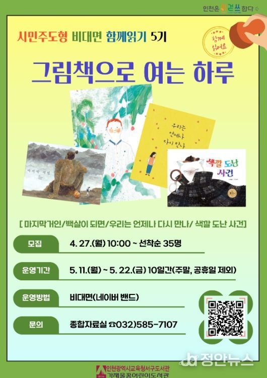 정안뉴스 안정주 기자 | 인천광역시교육청서구도서관(관장 정연순)은 2026년 시민주도형 비대면 함께읽기 5기로, 5월 11일부터 5월 22일까지 ‘그림책으로 여는 하루’ 프로그램을 운영한다.