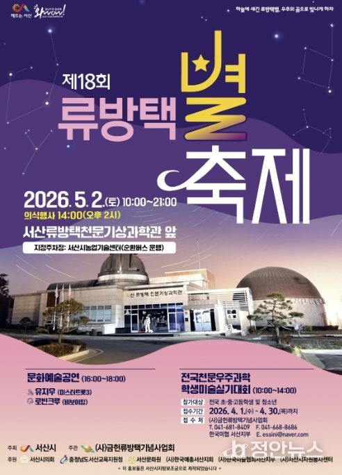 정안뉴스 안정주 기자 | 충남 서산시는 오는 5월 2일 류방택천문기상과학관 일원에서 제18회 류방택 별축제를 개최한다고 밝혔다.