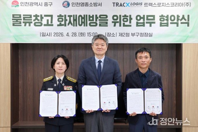 정안뉴스 안정주 기자 | 인천시 중구는 영종소방서, 트랙스로지스코리아㈜와 ‘물류창고 화재 예방을 위한 업무협약’을 체결했다고 29일 밝혔다.