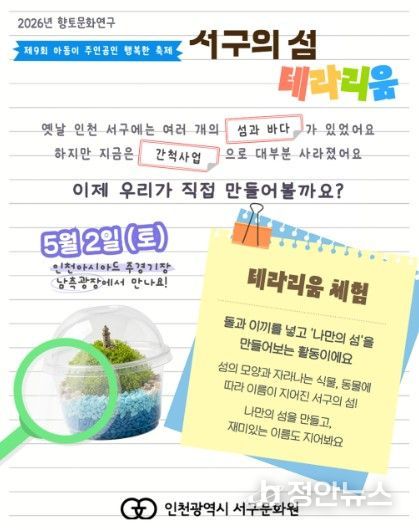 정안뉴스 안정주 기자 | 인천광역시 서구문화원은 오는 5월 2일 인천아시아드주경기장 남측광장에서 열리는 제9회 아동이 주인공인 행복한 축제’에서 ‘서구의 섬, 테라리움 만들기’ 체험 부스를 운영한다고 밝혔다.