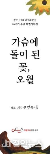 정안뉴스 안정주 기자 | 광주 동구는 5·18민주화운동 46주년을 기념해 인문거점시설인 시인 문병란의 집에서 특별 시화전 ‘가슴에 돌이 된 꽃, 오월’을 오는 5월부터 8월까지 개최한다고 밝혔다.