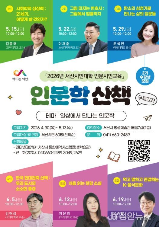정안뉴스 안정주 기자 | 서산시평생학습관에서 '인문학 산책 2기' 수강생을 4월 30일부터 5월 13일까지 모집한다.