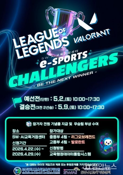 정안뉴스 안정주 기자 | 부산광역시교육청교육연구정보원은 오는 5월 2일과 9일 부산SW·AI교육거점센터 e스포츠 파크에서 부산 관내 중·고등학교 8개 팀이 참가한 가운데 ‘2026년 스와이(SWAI) 디지털 체험 페스티벌-e스포츠 챌린지 매치’를 개최한다.