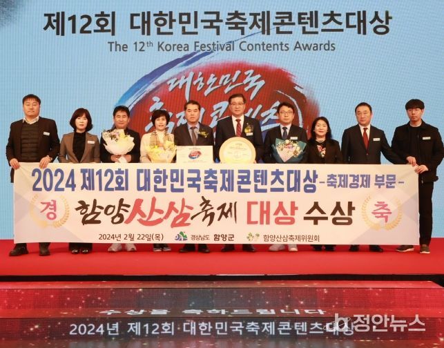 함양군은 2월 22일 한국축제콘텐츠협회의 주최로 서울 용산구 백범김구기념관에서 열린 ‘제12회 대한민국축제콘텐츠대상 시상식’에서 ‘축제경제 부문 대상’을 받았다고 밝혔다.