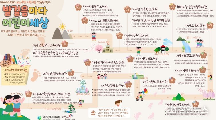 또한, ▲대구시립도서관 10곳은 책 놀이 활동, 독서 퀴즈, 동극 공연, 원화 전시 등 어린이의 인문ㆍ예술적 소양을 키울 수 있는 다양한 체험활동 프로그램을 운영할 계획이다.