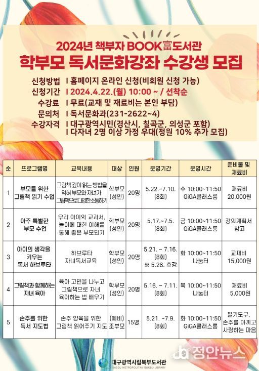 정안뉴스 황정혜 기자 | 대구북부도서관은 5월 가정의 달을 맞이하여 자녀 독서교육 역량 강화를 위한 특별한 독서강좌를 마련하고 4월 22일부터 참가자를 모집한다.