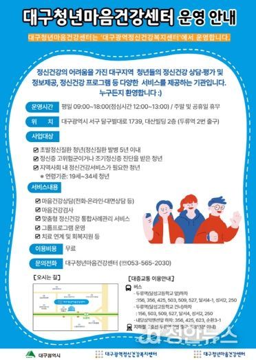 서구 내당동(두류역 2번 출구)에 위치한 대구청년마음건강센터는 정신건강의 어려움을 겪는 19세~34세 청년 누구든지 무료로 이용할 수 있으며, 이용 문의는 전화 또는 인터넷 누리집을 통해 자세한 내용을 확인할 수 있다.