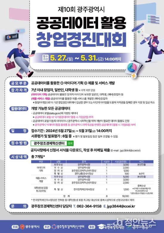 정안뉴스 박상욱 기자 | 광주광역시는 공공데이터를 활용한 창의적 아이디어와 비즈니스 모델을 발굴하고 창업을 활성화하기 위해 ‘제10회 광주광역시 공공데이터 활용 창업경진대회’를 6월12일부터 26일까지 연다.