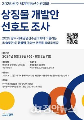 정안뉴스 박상욱 기자 | 광주광역시는 5월29일부터 6월2일까지 5일간 ‘2025 광주 세계양궁선수권대회’의 상징물인 슬로건, 엠블럼, 마스코트에 대한 선호도 조사를 진행한다.