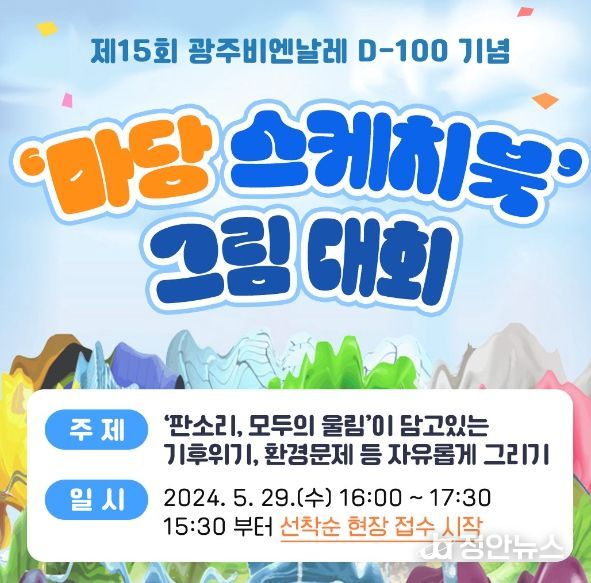 정안뉴스 박상욱 기자 | 광주광역시와 광주비엔날레재단은 29일 오후 4시부터 광주비엔날레 광장에서 제15회 광주비엔날레 D-100일을 기념하는 ‘마당 스케치북 그림그리기 대회’를 개최한다.