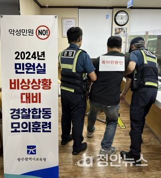 정안뉴스 박상욱 기자 | 광주시교육청이 31일 광주서부경찰서와 함께 민원실에서 발생할 수 있는 비상상황에 대비한 합동 모의훈련을 실시했다고 밝혔다.