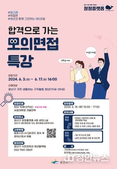 정안뉴스 박상욱 기자 | 광주 광산구는 취업을 준비 중인 청년을 대상으로 ‘합격으로 가는 모의 면접’ 특강을 운영한다고 밝혔다.