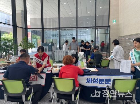 이날 하남지식산업센터에 차린 상생보건소에선 산단 노동자, 인근 직장인 등을 대상으로 혈압, 혈당, 체성분 분석 등 기초 검사와 만성질환 예방관리, 근골격계 예방 테이프 감기(테이핑), 금연 상담, 비만 예방 및 절주 등 다양한 건강서비스를 제공했다.