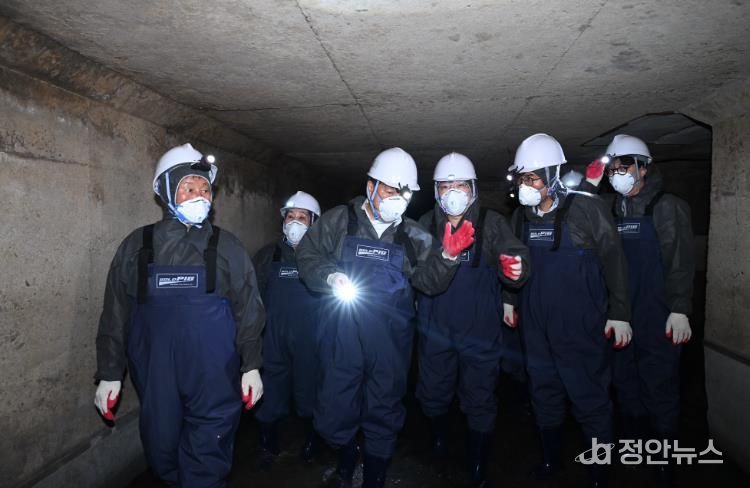 그는 이 일환에서 이날 오후 직원들과 함께 백운광장 주변 지하 하수암거에 진입, 하수관로 522m 구간을 둘러보며 모래 등 퇴적물과 시설 상태를 일일이 점검했다.