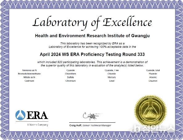 광주보건환경연구원은 먹는물 분야 평가 항목인 중금속, 휘발성유기화합물 등 총 17개 항목에서 ‘만족’을 받아 측정과 분석 능력에 대해 신뢰할 수 있는 최우수 분석기관임을 인정받았다.