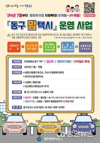 정안뉴스 박상욱 기자 | 광주 동구는 오는 7월부터 ‘동구 맘택시 운영 사업’ 지원 대상을 확대해 더 많은 가정이 혜택을 받을 수 있도록 한다고 밝혔다.
