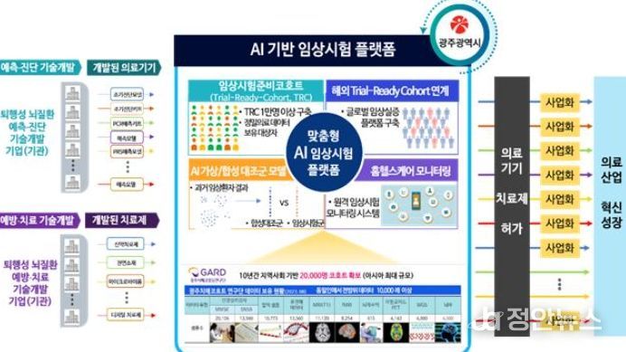 이에 광주시는 조선대학교 산학협력단(가드코호트연구단)이 구축한 약 2만명의 ‘아시아 최대 규모 지역기반 멀티 치매 코호트’를 활용해 ▲임상실증 맞춤형 대상자 선별 인공지능(AI)플랫폼 ▲원격 임상시험 모니터링 시스템 ▲인공지능(AI)기반 가상·합성 대조군 모델 등을 개발할 계획이다.