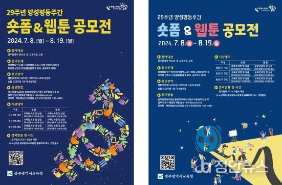 정안뉴스 박상욱 기자 | 광주시교육청은 오는 8월 19일까지 학생과 교원을 대상으로 ‘양성평등 콘텐츠(숏폼&웹툰) 공모전‘을 개최한다.