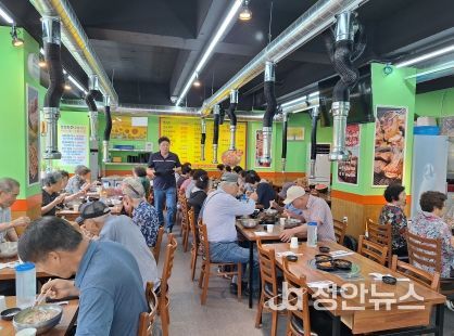 정안뉴스 안정주 기자 | 대구 북구 태전1동 맛있는 이오갈비 태전직영점은 초복을 맞아 7월 10일 관내 경로당 3개소(은마, 두성3차, 한라) 어르신 50명에게 삼계탕 나눔 활동을 펼쳤다.