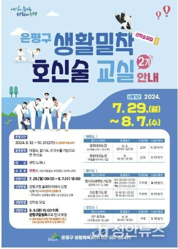 이번 하반기 호신술교실 신청은 관내 주민이면 누구나 가능하며, 오는 29일 월요일 오전 9시부터 내달 7일 오후 6시까지 은평구청 누리집에서 선착순으로 접수하면 된다.